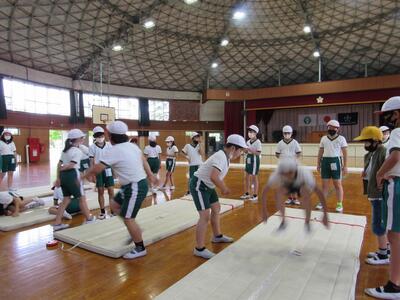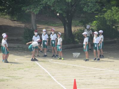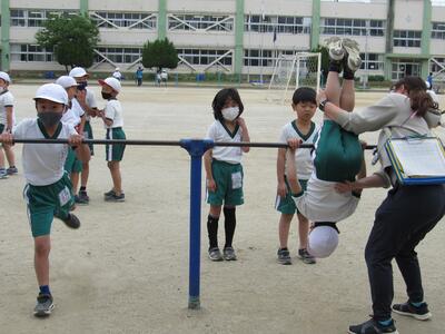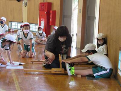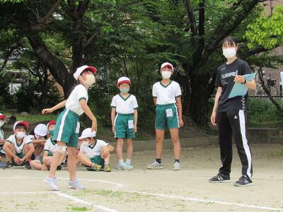 ◆2年生の新体力テストには、5年生が積極的にお手伝いをしているよ。
