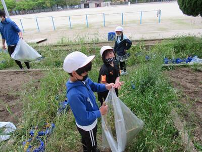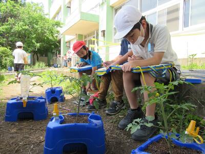 ◆爽やかな校庭で、2年生2クラスがミニトマトの観察をしているよ。