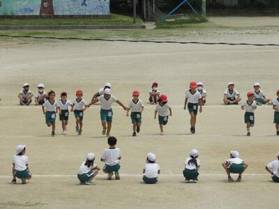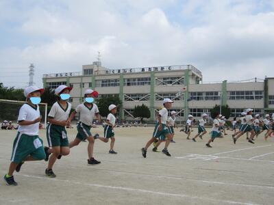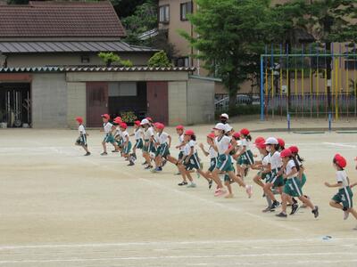 赤ぼうしが2年生、白ぼうしはシャトルランのペースメーカー5年生。