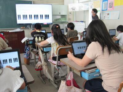 パソコンでピアノを弾いているんだね。音階をしっかりと身に付けていこう。