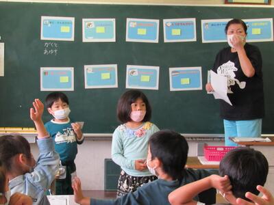 ◆1年生は、伸ばして発音する言葉を声に出したり、書いたりしているよ。