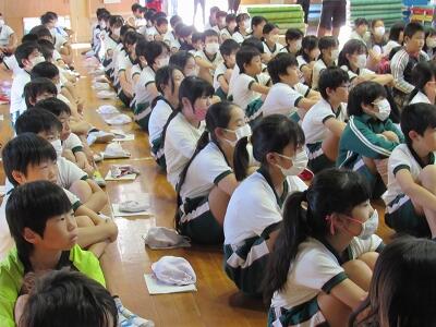 体育館には、4~6年生が集まり、教室では1~3年生がミートで参加ですね。