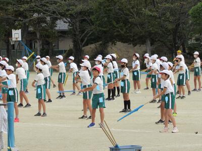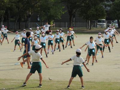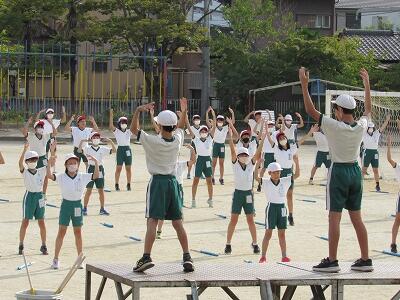 ◆校庭に5・6年生たちが集合し、準備運動としてラジオ体操第1を行っているね。