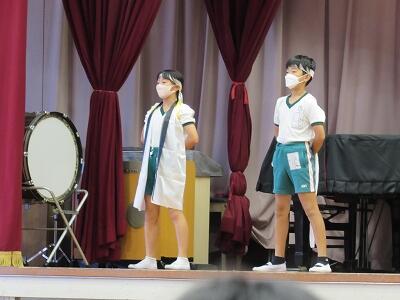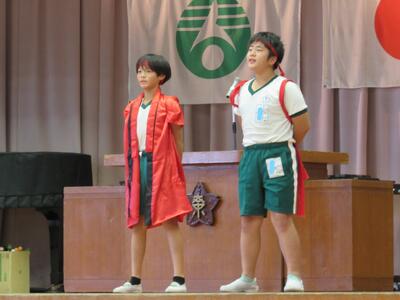 その後、今月の生活目標のキーワードである「全力で」を受けて、赤組、白組の応援団長たちがステージ上へ。
