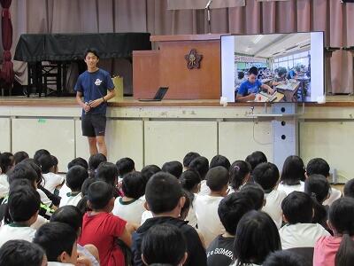 体育館には、4~6年生が集まり、教室では1~3年生がミートで参加ですね。