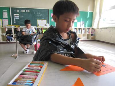 クレヨンで絵を描いたり、折り紙を切って貼り付けたりしているね。