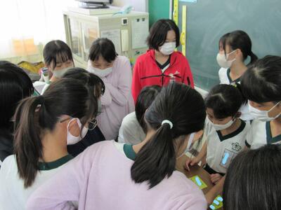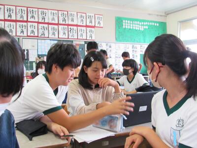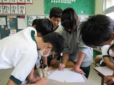校庭で行った実験結果を持ち寄り、表に整理して、分かったことを話合っているね。