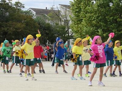 1・2年生による玉入れは、ダンスも組み込んだ楽しいスタイル!!