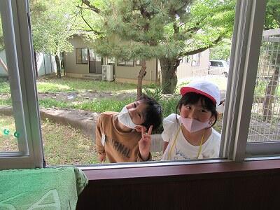 ◆校長室の窓に3年生が・・・「二人は何をしているの?」「理科で生き物探しです。」