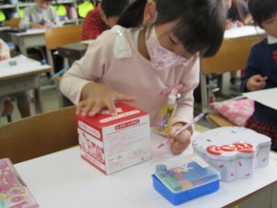 ◆1年生は、色々な箱などの形を使って、絵を描いているよ。