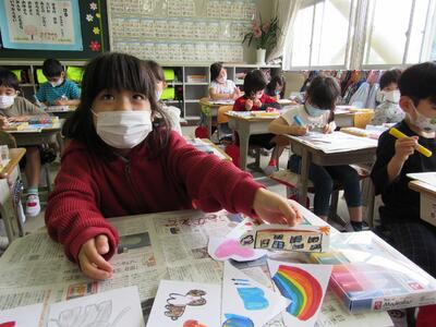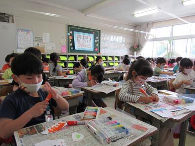 ◆1年生は、初めての図工「すきなものいっぱい」を楽しんでいるよ。