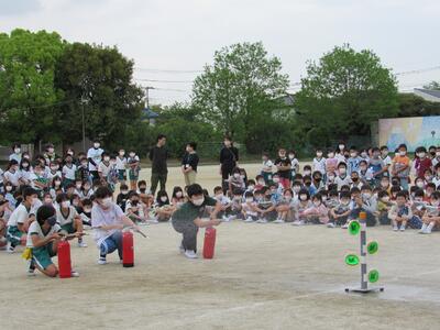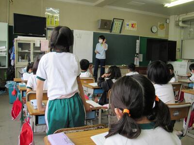 ◆3時間目、今年初めての避難訓練です。6年生が避難してきています。