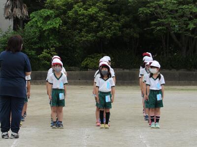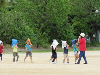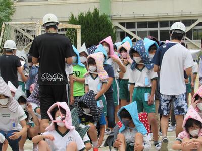 体育倉庫前に整列し、人数確認が終了です。避難開始から5分38秒かかりました。
