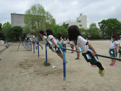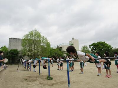 燕になって、音がしないように鉄棒から静かに下りているよ。