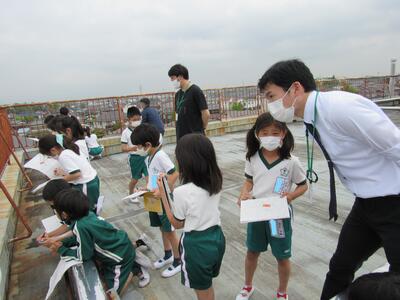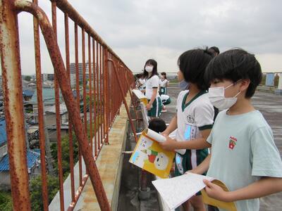 ◆3年生の社会科は、屋上に上がって東西南北の様子を観察・調査しているよ。