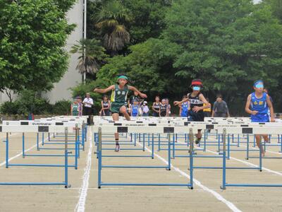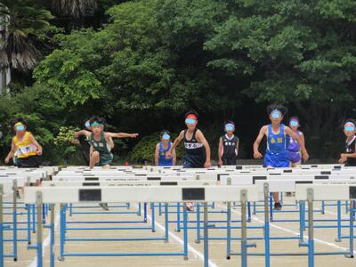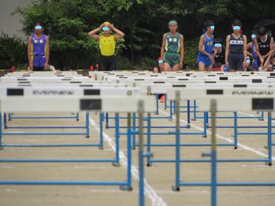 80メートルハードルの試走をするお手伝いのみんなは、大会運営を支えています。