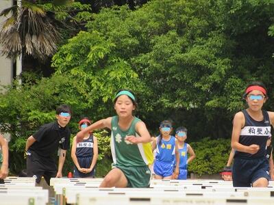 100メートルの試走にチャレンジしているお手伝いの児童たち