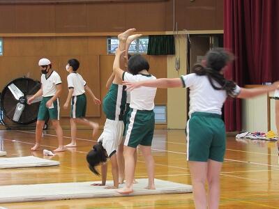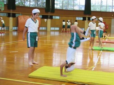 ◆体育館では、6年生が倒立を中心にチャレンジしているよ。