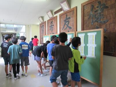 大会の記録表の前には、たくさんの子どもたちが集まっているよ。