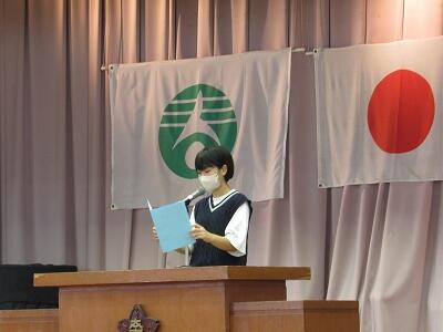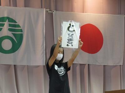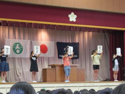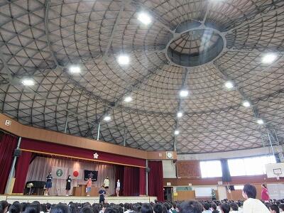 ◆体育館では、陸上大会の選手団の解散の式を行っているよ。