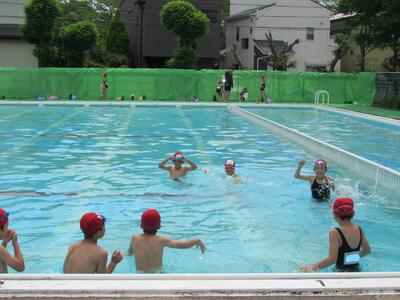 気温も水温もいい感じの中、1年生が水泳学習をしているよ。