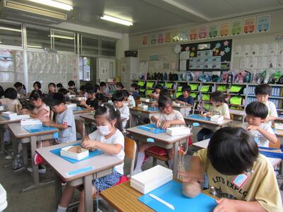 「校長先生、全部で50羽の鶴を折るんです。」 「丁寧に折れているね。」