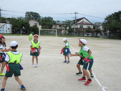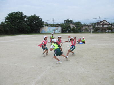 ★今日は、校庭が雨の影響で水たまりがあったため、リレー選手のみ使用し、他の児童は、一段上のエリアで遊ぶことになりました。リレー選手は、バトンパスの仕上げの段階です。