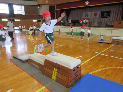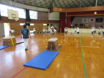 ★台上前転に取り組んでいました。スモールステップの場が設定されていたので、こどもたちが小さな「できた」を味わいながら自信をもって取り組んでいました。