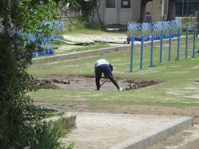★5時間目の校庭を見ると校庭の水が驚くほど減っていました。そして、そこにあったのは、体育主任と副主任の姿でした。(ちょうど空き時間だったそうです。)