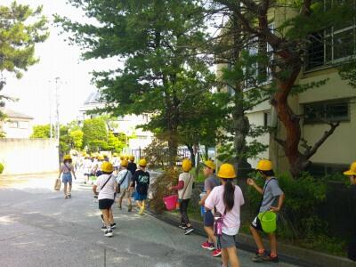 ★6時間目の校庭を見てみると、6年2組が一生懸命作業をしています。バケツに水を溜めて運んでいます。