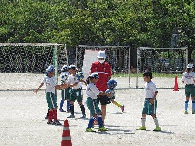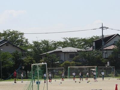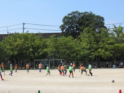 1・2年生のみんなは、インサイドキックゲームをしています。