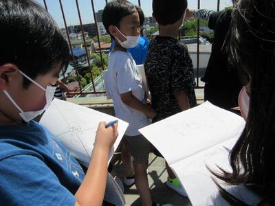 ◆3年生は、屋上に上がって、東西南北の方向に何があるか調査をしているよ。