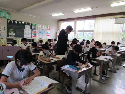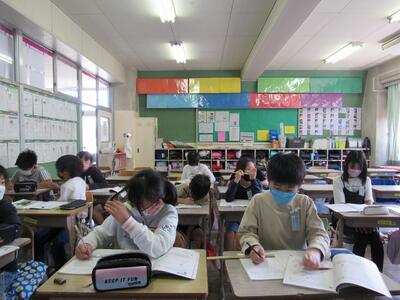 ◆4年生は、1つのクラスが2つに分かれ、2人の先生と真剣に算数を学んでいるよ。