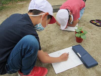 ◆「たんぽぽ学級」は、植物の観察をし、ワークシートに記録しているよ。