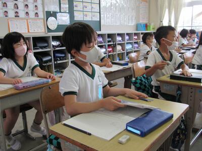 ◆3時間目、今年初めての避難訓練です。6年生が避難してきています。