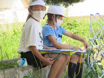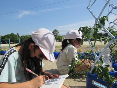 ◆爽やかな校庭で、2年生2クラスがミニトマトの観察をしているよ。