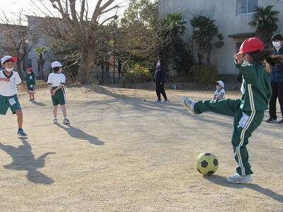 ◆校庭では、1年生がサッカー遊びをしているよ。
