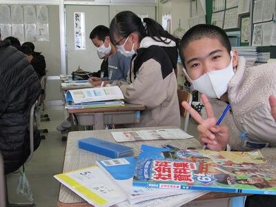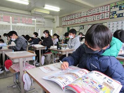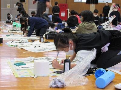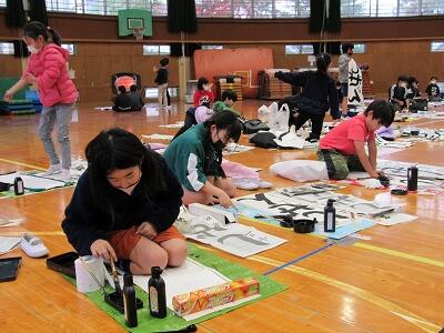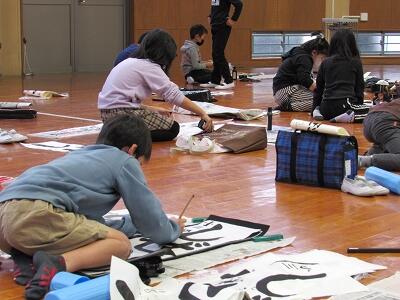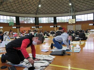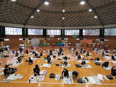 ◆体育館では、3年生が書きぞめ競書会を行っているよ。