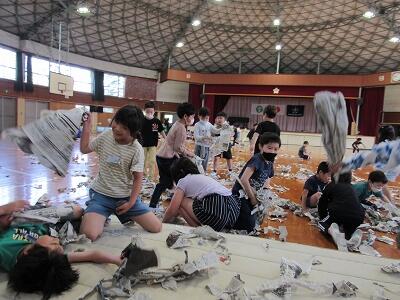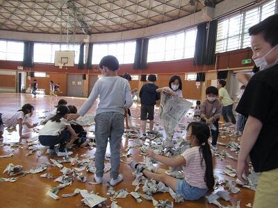 新聞紙を使って、ボールを投げたり、雪が降る様子を表したり、楽しいね。