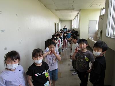 安全担当の先生の話をしっかりと聴いていて、今日の避難訓練は90点!!