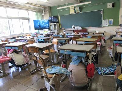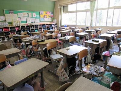 4年生の教室では、机の下にもぐり、だれも話をしていませんね。