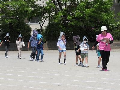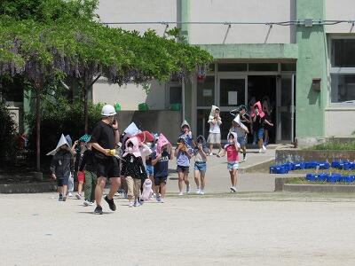 給食室から出火したことを想定した避難指示に従い、校庭への避難が始まっているよ。(2年生)
