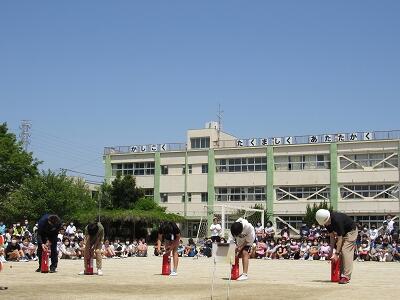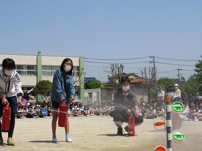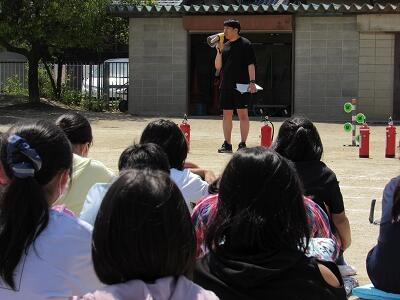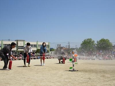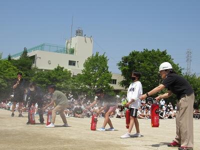 その後、水消火器を使っての消火訓練(先生、5・6年生)