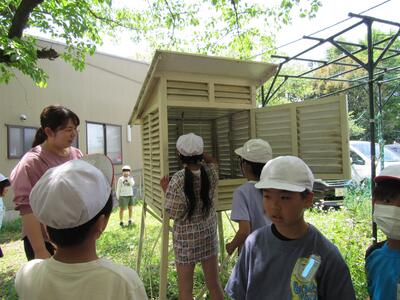 百葉箱を開いて、気温を調べているんだね。 「23℃もあるよ。」