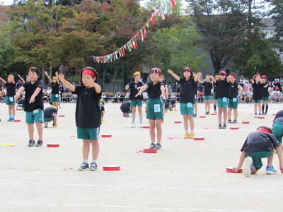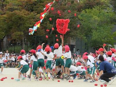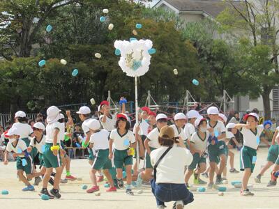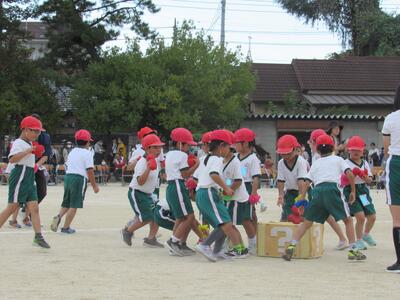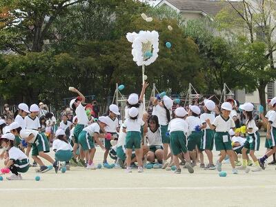 1・2年生による玉入れは、ダンスも組み込んだ楽しいスタイル!!