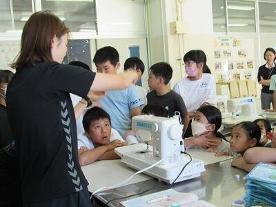 ◆家庭科室では、5年生がミシンの使い方を習得しようとしているよ。