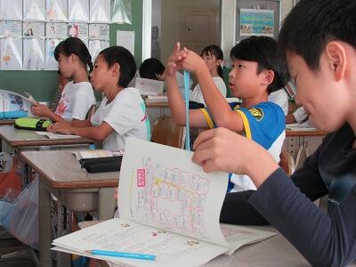 3年生の算数は、みんなで黒板の図を見ながら、自分の考えを紹介し合っているよ。