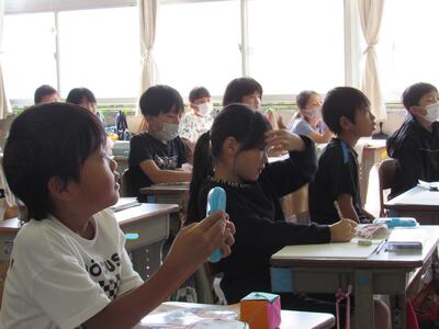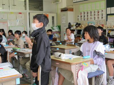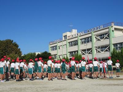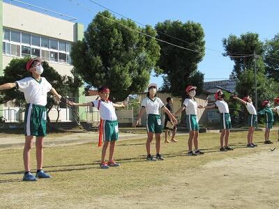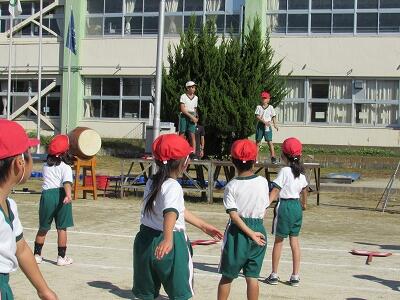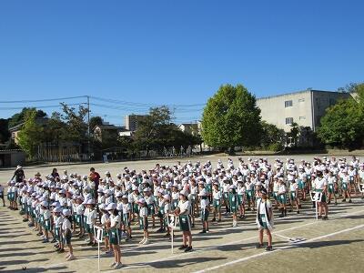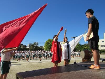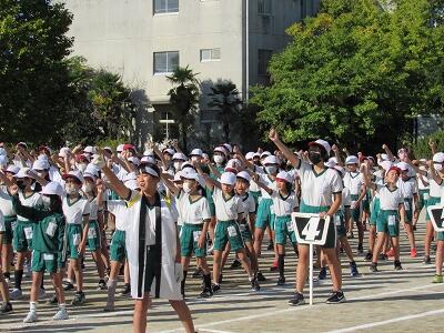 続いて、音楽委員会の5・6年生が、校歌や運動会の歌をリードしているね。