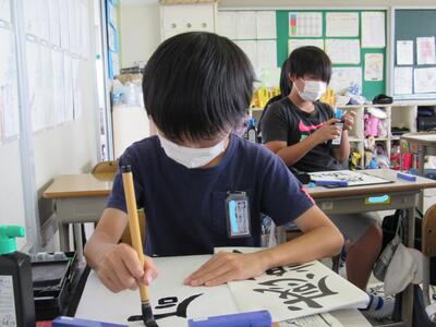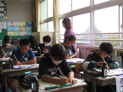 ◆となりの6年生は、「感謝」の気持ちを込めて、毛筆をしているよ。