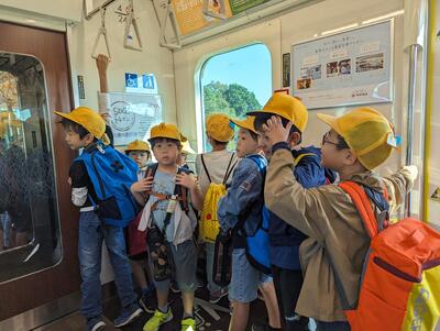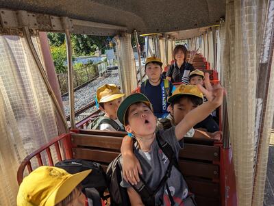 ◆1年生とたんひま学級のみんなが、汽車に乗って出発です。